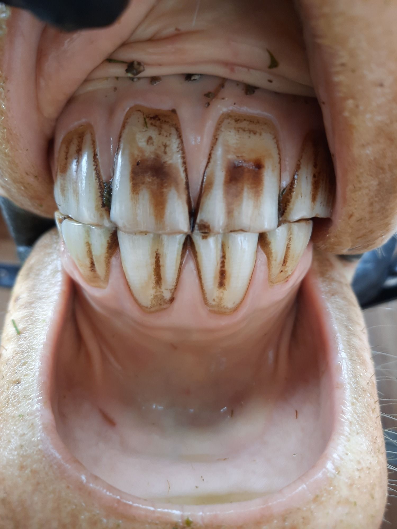 Oftmals werden Verfärbungen als besorgniserregend empfunden. Dabei ist es bei Pferden völlig normal, dass sich die Zähne verfärben. Dies liegt an der Raufutteraufnahme.